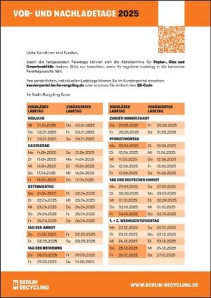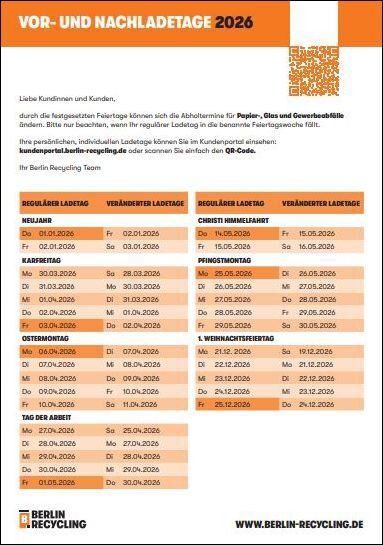 bedingt durch die festgesetzten Feiertage verändern sich die Abholtermine für Ihre Papier-, Glas- und Gewerbeabfälle. Damit Sie keinen Termin verpassen, finden Sie hier unseren Abfuhrkalender mit den Ladetagsverschiebungen. Bitte nur beachten, wenn Ihr regulärer Ladetag in die benannte Feiertagswoche fällt.